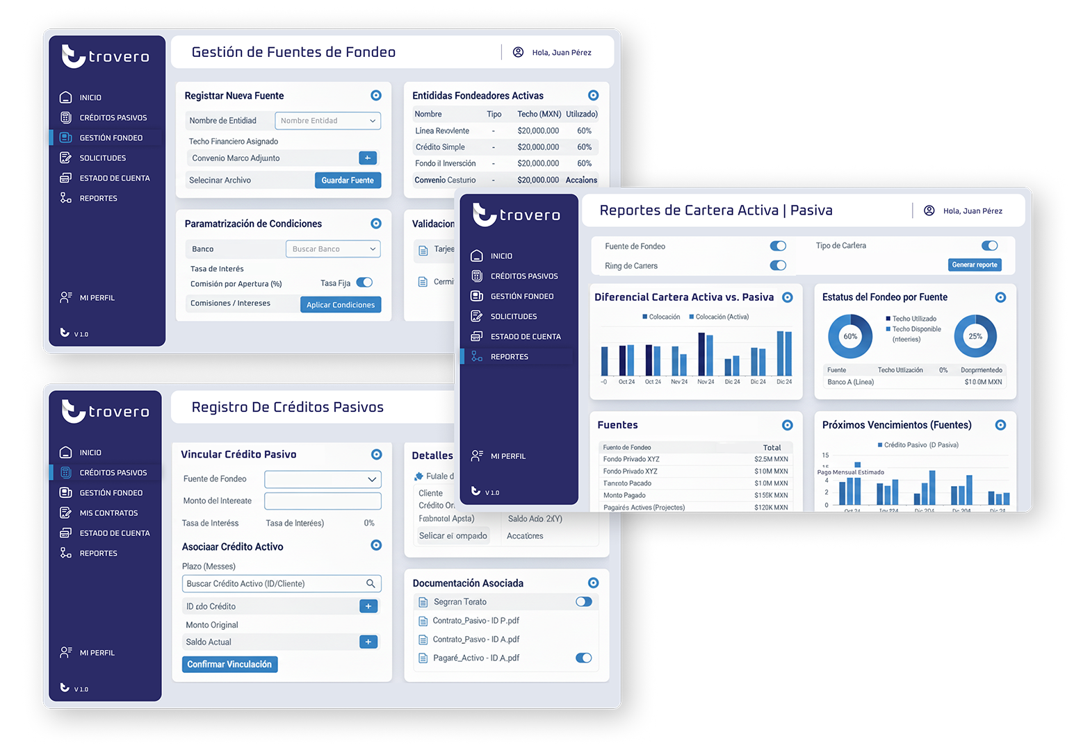 Integra la gestión de pasivos derivados de la originación de créditos activos, permitiendo un control detallado de fondeos, convenios y relaciones de apalancamiento financiamiento.